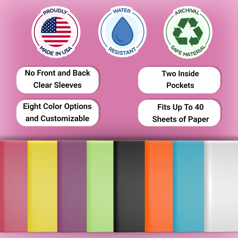 These economy-style folders offer a professional, no-frills solution. The Katie’s folder differs from the Nicky’s Folder line in that it has no front and back full clear sleeves. Perfect for classrooms, conferences, job fairs, and promotional events.